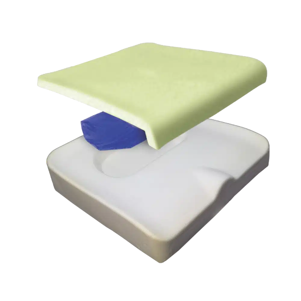 Diese Kissen bieten hervorragenden Hautschutz und eine präzise Positionierung. Sie verfügen über eine Standard-Deckschicht aus viskoelastischem Schaum sowie über einen zweikammerigen Einsatz aus wässrig-viskosem Gel im Sitzbeinbereich zur verbesserten Druckentlastung. Die mittlere Konturierung sorgt für zusätzlichen Komfort und Unterstützung, während der CoolCore-Bezug zur Standardausstattung gehört.